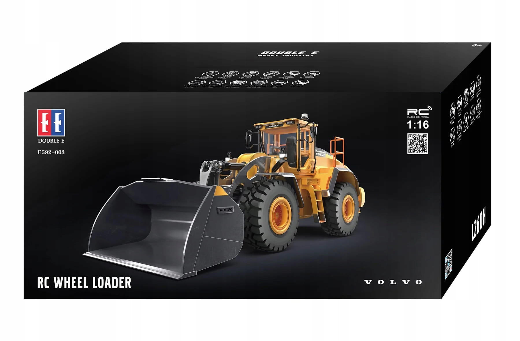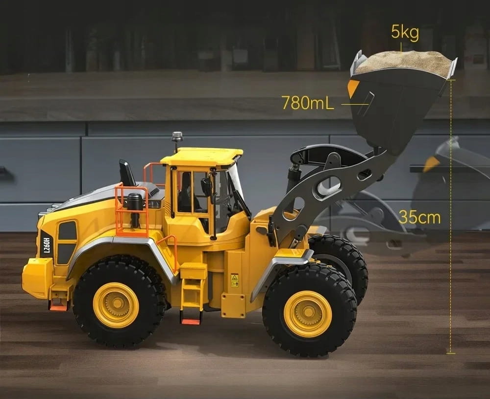 Double E E592-003 Volvo L260H RC Loader to precyzyjnie odwzorowany model ładowarki kołowej, który zapewnia autentyczne doznania zdalnie sterowanego pojazdu budowlanego.
