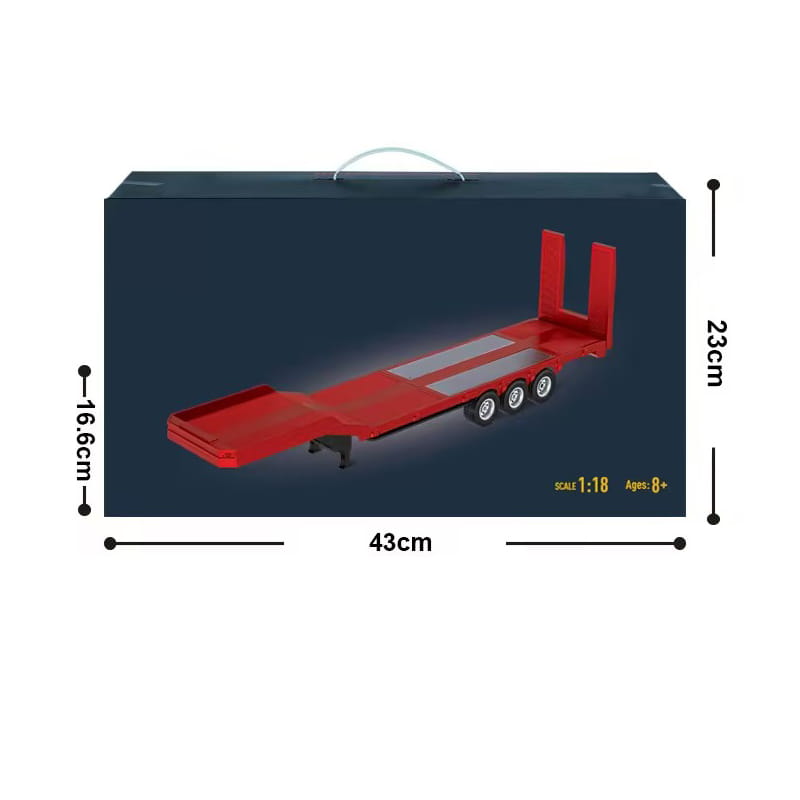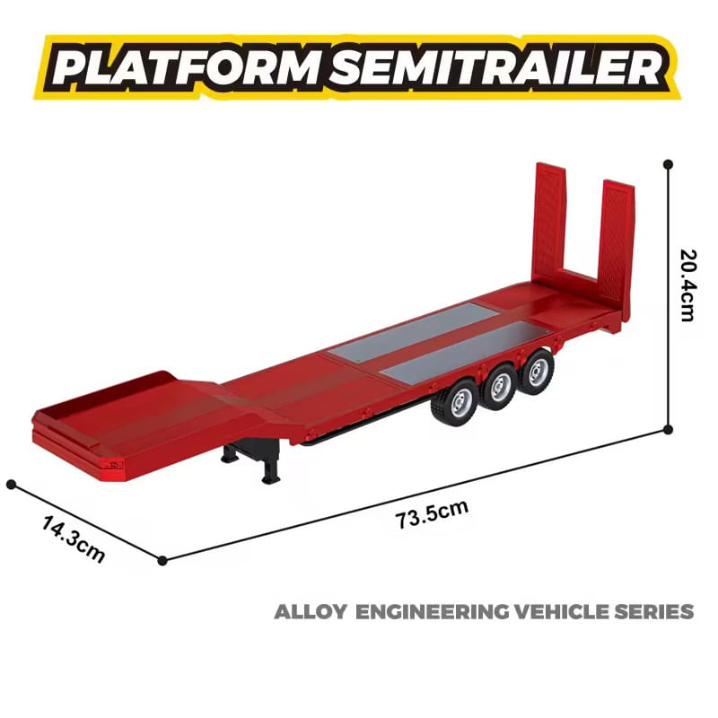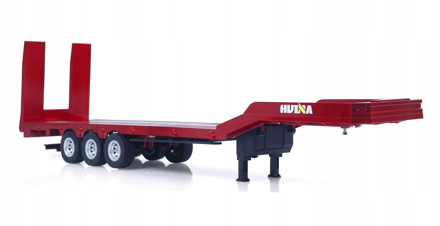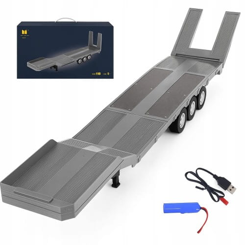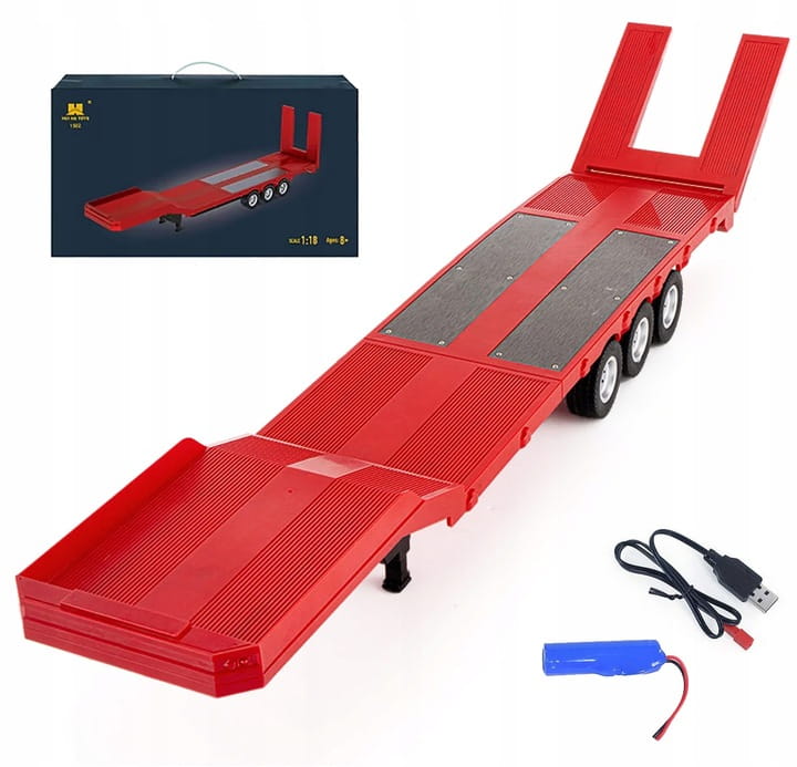 Realistyczna, 3-osiowa naczepa typu flatbed do modeli ciężarówek w skali 1:18. Zaprojektowana specjalnie do współpracy z ciągnikiem Huina 1501 (Scania 770). Po podpięciu sterujesz elektryczną rampą tylną oraz elektrycznymi podporami bezpośrednio z aparatury ciężarówki. Metalowe poszycie platformy zwiększa wytrzymałość, a długość około 73,5 cm daje mnóstwo miejsca na „ładunek” – koparki, ładowarki, samochody czy inne modele.