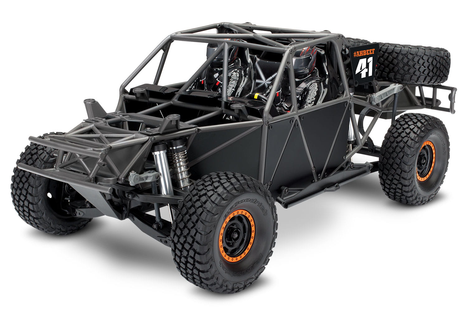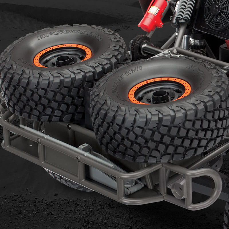 Podobnie jak w prawdziwej ciężarówce na pustynnym wyścigu, dwa koła zapasowe są zamontowane na tylnej ramie. Są Identyczne z pozostałymi czterema, są w pełni funkcjonalne i gotowe do zamontowania. Wał napędowy zamontowany na ramie to również w pełni funkcjonalny zapas do ewentualnego montażu.