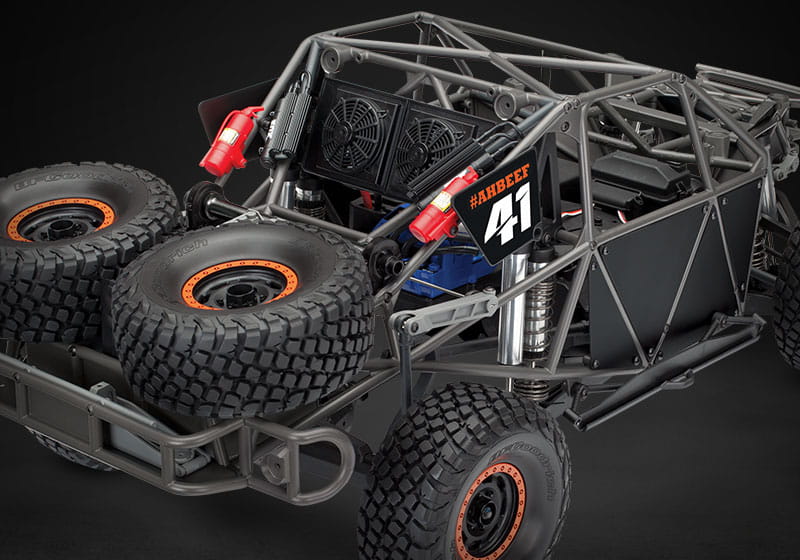 Unlimited Desert Racer został zaprojektowany w oparciu o autentyczne podwozie samochodów wyścigowych z napędem na 4 koła. 4-linkowa, solidna konstrukcja tylnej osi zapewnia ogromną amortyzację przy zachowaniu autentycznej dynamiki jazdy. Od amortyzujących pałąków wspornika do amortyzatorów 8 GTR, Traxxas dokładnie oddał prawdziwe podwozie wyścigowe zarówno pod względem formy, jak i funkcji.