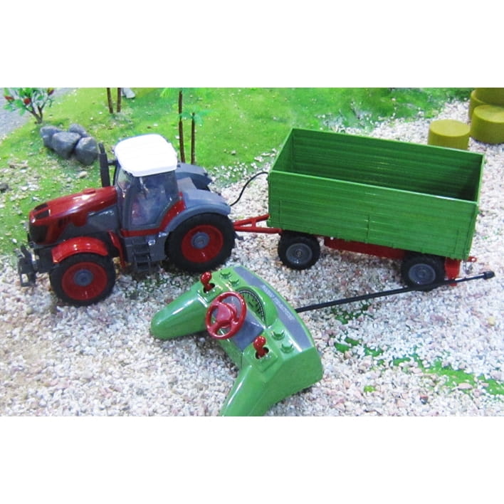 ZDALNIE STEROWANY TRAKTOR Z PRZYCZEPĄPosiada ergonomicznego pilota który jest  wyposażony w różne funkcje.Porusza się w kierunkach: prawo lewo przód tył.Traktor jest bardzo zwrotny i doskonale odzwierciedla manewrowanie prawdziwym pojazdem.Pilotem można również sterować naczepą co umożliwi zrzucenie ładunku.Traktor i naczepa wyposażona jest w gumowe koła – znakomicie imitujące prawdziwe opony.Sam traktor posiada amortyzatory (przód pojazdu) co dodatkowo wpływa na jakość jazdy.Pilot pozwala na wykonanie manewrów:- jazda do przodu- jazda do tyłu- skręt w prawo- skręt w lewo- podnoszenie i opuszczanie przyczepy.W skład zestawu wchodzi:- traktor- przyczepa- pilot zdalnego sterowania.Zabawka jest zasilana 3 bateriami typu AAA  oraz 1 baterią 9V (pilot) – brak baterii w zestawieWymiary traktora21 cm x 9 cm x 12 cmWymiary przyczepy25 cm x 9 cm  x 11 cmWymiary opakowania17 cm x 60 cm x 18 cm
